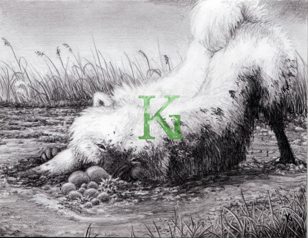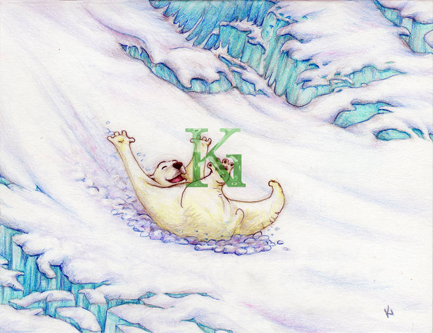 Original hand-drawn graphite-pencil and pencil crayon "Polar Bear Sledding" illustration by Kerie Green, reprinted here on high-quality card stock (10.8 cm x 13.9 cm). Suitable for any occasion - no inscription within card. Each card comes with its own envelope.