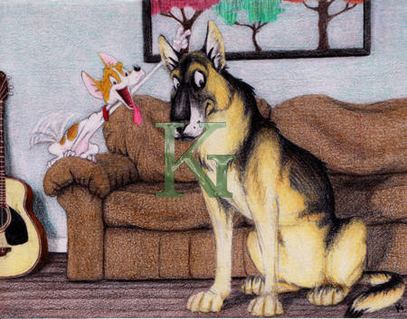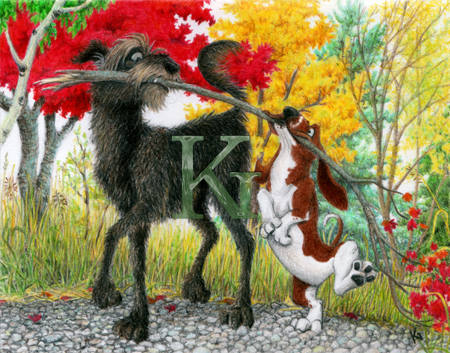 Original hand-drawn graphite-pencil and pencil-crayon "Dog Buddies" illustration by Kerie Green, reprinted here on high-quality card stock (10.8 cm x 13.9 cm). Suitable for any occasion - no inscription within card. Each card comes with its own envelope.