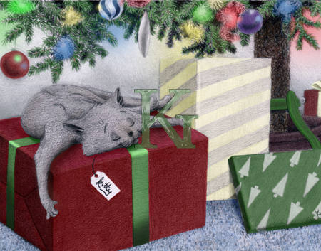 An original hand-drawn, in graphite-pencil and digital color "Kitten Christmas" illustration by Kerie Green, reprinted here on high-quality card stock (10.8 cm x 13.9 cm). Christmas themed image - no inscription within card. Each card comes with its own envelope.