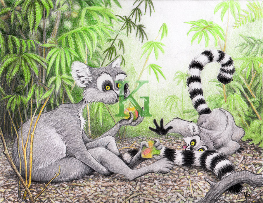 Original hand-drawn graphite-pencil and pencil crayon "Lemurs" illustration by Kerie Green, reprinted here on high-quality card stock (10.8 cm x 13.9 cm). Suitable for any occasion - no inscription within card. Each card comes with its own envelope.