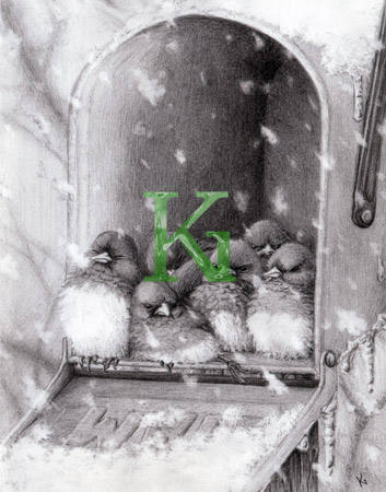 Original hand-drawn graphite-pencil "Chilly Birds" illustration by Kerie Green, reprinted here on high-quality card stock (10.8 cm x 13.9 cm). Suitable for any occasion - no inscription within card. Each card comes with its own envelope.