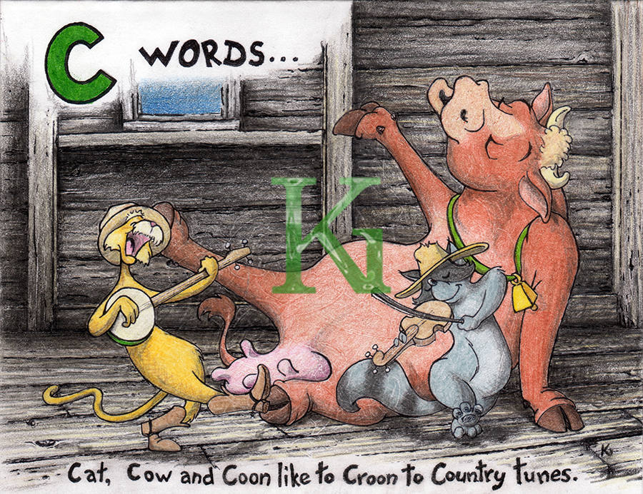 Original hand-drawn graphite-pencil and pencil crayon "C Words" illustration by Kerie Green, reprinted here on high-quality card stock (10.8 cm x 13.9 cm). Suitable for any occasion - no inscription within card. Each card comes with its own envelope.