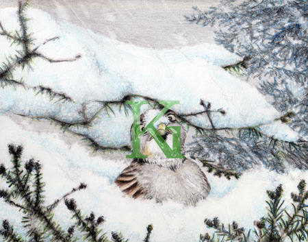 Original hand-drawn graphite-pencil and pencil crayon "Snowy Sparrow" illustration by Kerie Green, reprinted here on high-quality card stock (10.8 cm x 13.9 cm). Suitable for any occasion - no inscription within card. Each card comes with its own envelope.