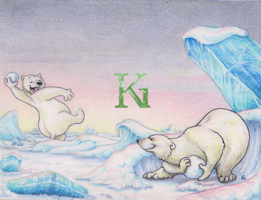 Original hand-drawn graphite-pencil and pencil crayon "Polar Bear Snowball Fight" illustration by Kerie Green, reprinted here on high-quality card stock (10.8 cm x 13.9 cm). Suitable for any occasion - no inscription within card. Each card comes with its own envelope.