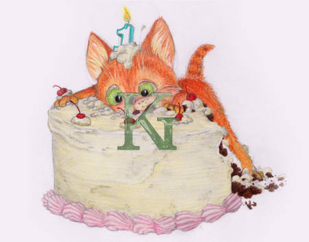 Original hand-drawn graphite-pencil and pencil-crayon "Kitten Cake" illustration by Kerie Green, reprinted here on high-quality card stock (10.8 cm x 13.9 cm). Suitable for birthdays/anniversaries - no inscription within card. Each card comes with its own envelope.