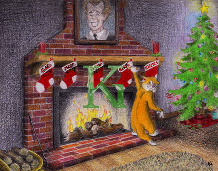Original hand-drawn graphite-pencil and pencil crayon "Christmas Stockings" illustration by Kerie Green, reprinted here on high-quality card stock (10.8 cm x 13.9 cm). Suitable for any occasion - no inscription within card. Each card comes with its own envelope.